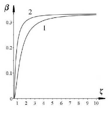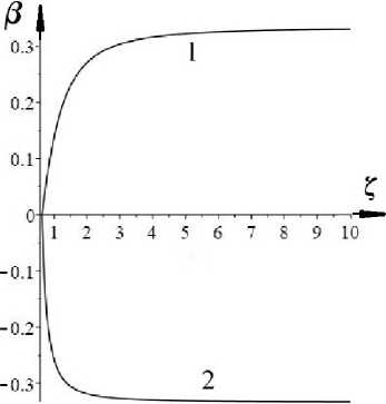 Рис. 4. Поведение функции состояния в для Вселенной с (f 0 = 1 (кривая 1 при отсутствии массовой материи) и f o = —1 (кривая 2 при наличии вакуумного состояния). Кривые 1 и 2 являются почти зеркальным отражением друг друга относительно оси ζ .
