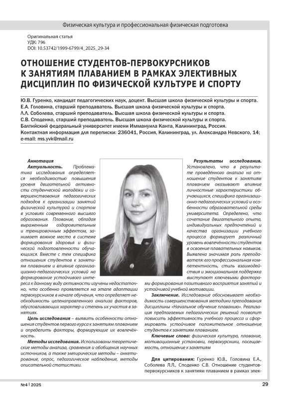 Актуальность. Проблематика исследования определяется необходимостью повышения уровня двигательной активности студенческой молодёжи и совершенствования педагогических подходов к организации занятий физической культурой и спортом в условиях современного высшего образования. Плавание, обладая выраженным оздоровительным и тренировочным эффектом, занимает важное место в системе формирования здоровья и физической подготовленности обучающихся. Вместе с тем специфика отношения студентов к занятиям плаванием и влияние организационно-педагогических условий на формирование устойчивого интереса к данному виду активности изучены недостаточно, что особенно проявляется на этапе адаптации первокурсников в начале обучения, что определяет необходимость целенаправленного анализа факторов, обусловливающих характер и степень их участия в занятиях. Цель исследования – выявить особенности отношения студентов первого курса к занятиям плаванием и определить факторы, формирующие их вовлечённость. Методы исследования. Использованы теоретические методы анализа, сравнения и обобщения научных источников, а также эмпирические методы – анкетирование, опрос, педагогическое наблюдение, методы описательной статистики. Результаты исследования. Установлено, что в результате проведённого анализа на отношение студентов к занятиям плаванием оказывают влияние личностные характеристики обучающихся, специфика организационно-педагогических условий и особенности образовательной среды университета. Определено, что сочетание двигательного опыта, индивидуальных предпочтений и качества организации учебного процесса формирует различный уровень вовлечённости студентов в освоение плавательных навыков. Выявлена значимая роль преподавателя: его профессиональная компетентность, стиль взаимодействия и эмоциональная поддержка выступают ключевыми факторами формирования позитивного восприятия занятий и устойчивой учебной мотивации. Заключение. Исследование обосновывает необходимость совершенствования методики преподавания дисциплины «Начальное обучение плаванию». Реализация предлагаемых педагогических решений позволит повысить эффективность учебного процесса и сформировать устойчивое положительное отношение студентов к занятиям плаванием.