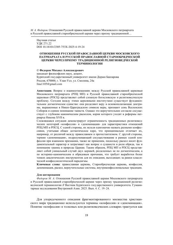 Федоров М. А. Отношения Русской православной церкви Московского патриархата и Русской православной старообрядческой церкви через призму традиционной религиоведческой терминологии // Вестник Бурятского государственного университета. Гуманитарные исследования Внутренней Азии. 2025. Вып. 4. С. 19–24.