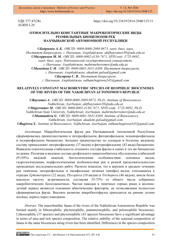 Макробентическая фауна рек Нахчыванской Автономной Республики сформировалась преимущественно в литореофильном, фитореофильном, псаммореофильном и пелореофильном биоценозах. Большое преимущество по площади и богатому видовому составу принадлежит литореофильному (37 видов) и фитореофильному (43 вида) биоценозам. Выявлена относительная стабильность сезонного состава фауны в одних и тех же биоценозах по рекам. Различия в видовом составе реофильного макрозообентоса обусловлены стабильной (Р≤50%) видовой заменой, биологическими особенностями основных видов, гидрологическими, морфологическими особенностями рек и разной продолжительностью проводимых исследовательских работ. Расчеты показали, что в верхнем и среднем течениях рек типичные литореофильные и оксифильные личинки (нимфы) видов, относящиеся к отрядам Ephemeroptera (22 вида), Plecoptera (10 видов) и Trichoptera (40 видов), имели более высокую частоту встречаемости, составляя 55-75% от общего числа собранных макробентических беспозвоночных. Частые паводки в типичных горных реках в весенне-летний период являются основным абиотическим фактором, не позволяющим полностью сформироваться фауне. Высокое развитие макробентофауны приходится на ранние летние месяцы, период перед паводками.