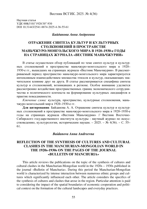 Взаимодействие культур – важный фактор развития любого полиэтничного региона. Пространство маньчжуро-монгольского мира представляет особый интерес благодаря своей многослойности и динамики сосуществования различных культур на протяжении многих веков. Историко-культурные трансформации здесь обусловлены контактами монгольских племен, маньчжуров, китайцев, русских переселенцев и представителей других народов. Важную роль в этом процессе играют экономические связи, политические события и образовательные инициативы, способствующие синтезу и столкновению культур, нашедшие отражение на страницах журнала «Вестник Маньчжурии». Именно этот журнал (издавался в г. Харбин) стал ведущим экономическим изданием в Восточной Азии, выходившем в 1925–1934 гг. на русском языке с аннотациями на английском.