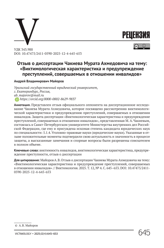 Представлен отзыв официального оппонента на диссертационное исследование Чакиева Мурата Ахмедовича, которое посвящено рассмотрению виктимологической характеристики и предупреждению преступлений, совершаемых в отношении инвалидов. Защита диссертации «Виктимологическая характеристика и предупреждение преступлений, совершаемых в отношении инвалидов», представленная М.А. Чакиевым, состоялась в Санкт-Петербургском университете Министерства внутренних дел Российской Федерации, где ему и присуждена искомая степень кандидата юридических наук по специальности: 5.1.4. Уголовно-правовые науки (юридические науки). Указанные в отзыве положительные моменты подтвердили свою актуальность и значимость в процессе защиты, а высказанные замечания и спорные вопросы были разрешены соискателем в полном объеме.