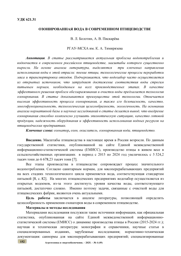 Материалами исследования послужили такие источники информации, как официальная статистика, опубликованная на сайте Единой межведомственной информационностатистической системы (ЕМИСС) о динамике производства птицы в России (2015-2024 гг.); научная и техническая литература: монографии и справочники, научные статьи в специализированных изданиях, зарубежные исследования; нормативно-техническая документация: саннормы для мясоперерабатывающих предприятий; специализированные отраслевые источники: данные по нормам водопотребления в птицеводстве, информация от производителей оборудования (озонаторов); технологические регламенты: описания стандартных технологических процессов переработки птицы.