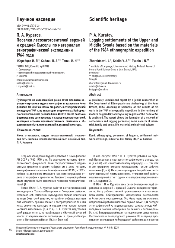 П. А. Куратов. Поселки лесозаготовителей верхней и средней Сысолы по материалам этнографической экспедиции 1964 года