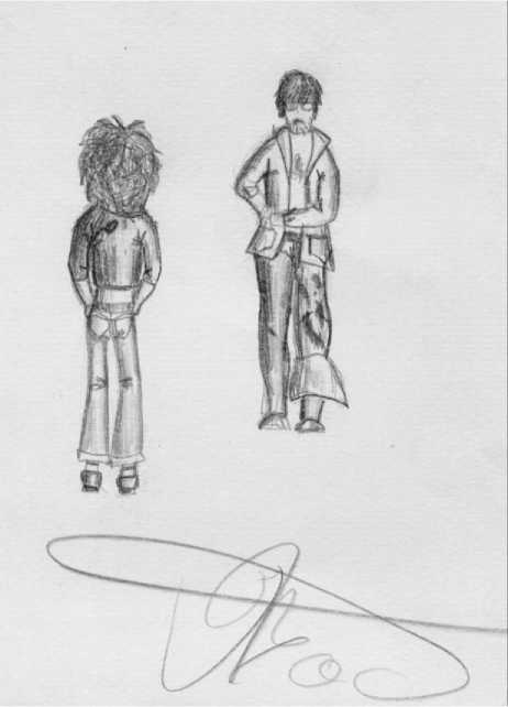 Рис. 2. Рисунок школьника Димы Рябикова, окончившего 9-й класс, сделан в Красносамарском лесничестве в 1978 году. На рисунке Дима стоит спиной, а лицом к нам – Юра Герасимов, студент химико-биологического факультета, закончивший 4 курс, на преддипломной практике, которая длилась с 17 мая до 2 августа. Ю.Л. Герасимов занимался рыбами, одет для выхода к реке и озерам в ветровку и болотные сапоги (из личного архива Н.В. Прохоровой).