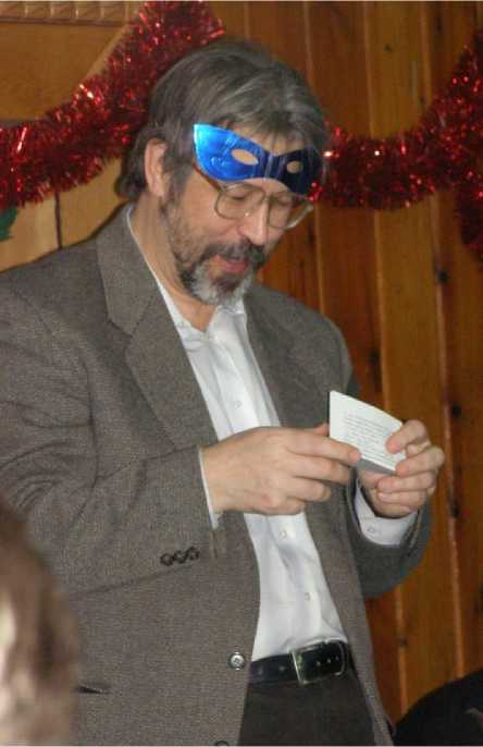 Юрий Леонидович читает поздравление в стихотворной форме на праздновании Нового года на биологическом факультете, 2009 год. Фото Е.С. Корчикова.