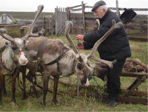 Leading Researcher, Candidate of Sciences (Biology) V. S. Matyukov is examining reindeer of the Production Agricultural Cooperative “Olenevod [Reindeer-Breeder]” (2010).