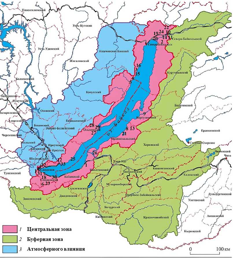 Примечание: 1 — Боярский разрез (1981), 2 — Верхнеангарский источник (1980), 3 — водопад Большой Каскад на р. Куркуле (1985), 4 — водопад на р. Безымянной (2018), 5 — водопад на р. Заво-ротницкой (2018), 6 — водопады р. Подкомарной (2017), 7 — гора Чапаевка (2017), 8 — Горячин-ский источник (1984), 9 — Гусихинский источник (1984), 10 — Дзелиндинские источники (1980), 11 — Ирканинский источник (1980), 12 — исток р. Ангары (2017), 13 — источник Золотой ключ (1984), 14 — Корикейский источник (1980), 15 — Котельниковский источник (1980), 16 — ледник Солнечный (1987), 17 — мыс Шаманский (2017), 18 — обнажение вулканических пород в районе метеостанции «Хамар-Дабан» (2017), 19 — оз. Блудное (1988), 20 — оз. Большое Кичерское (1988), 21 — оз. Котокель (1975), 22 — оз. Кулинда (1981), 23 — оз. Сердце (2017), 24 — оз. Сикили (1988), 25 — остров Бакланий камень (2017), 26 — острова Горбуниха, Митрохин и Приморский (1980), 27 — петроглифы у деревни Куртун (2018), 28 — петроглифы у р. Куртун (2018), 29 — пещера Чека-новского (2022), 30 — популяция тридактилины Кирилова (2018), 31 — Слюдянское озеро (2017), 32 — Таловский озерно-болотный комплекс (2024), 33 — Шаман-камень (2017).