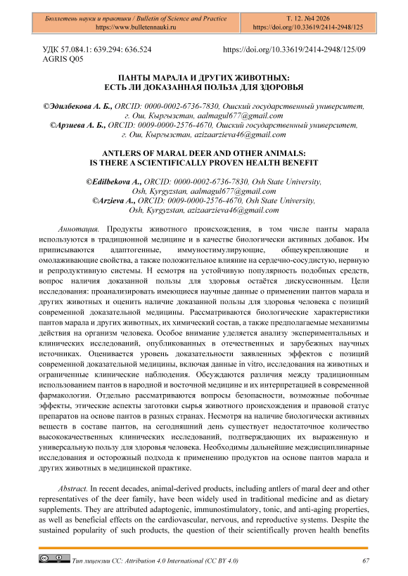Продукты животного происхождения, в том числе панты марала используются в традиционной медицине и в качестве биологически активных добавок. Им приписываются адаптогенные, иммуностимулирующие, общеукрепляющие и омолаживающие свойства, а также положительное влияние на сердечно-сосудистую, нервную и репродуктивную системы. Н есмотря на устойчивую популярность подобных средств, вопрос наличия доказанной пользы для здоровья остаётся дискуссионным. Цели исследования: проанализировать имеющиеся научные данные о применении пантов марала и других животных и оценить наличие доказанной пользы для здоровья человека с позиций современной доказательной медицины. Рассматриваются биологические характеристики пантов марала и других животных, их химический состав, а также предполагаемые механизмы действия на организм человека. Особое внимание уделяется анализу экспериментальных и клинических исследований, опубликованных в отечественных и зарубежных научных источниках. Оценивается уровень доказательности заявленных эффектов с позиций современной доказательной медицины, включая данные in vitro, исследования на животных и ограниченные клинические наблюдения. Обсуждаются различия между традиционным использованием пантов в народной и восточной медицине и их интерпретацией в современной фармакологии. Отдельно рассматриваются вопросы безопасности, возможные побочные эффекты, этические аспекты заготовки сырья животного происхождения и правовой статус препаратов на основе пантов в разных странах. Несмотря на наличие биологически активных веществ в составе пантов, на сегодняшний день существует недостаточное количество высококачественных клинических исследований, подтверждающих их выраженную и универсальную пользу для здоровья человека. Необходимы дальнейшие междисциплинарные исследования и осторожный подхода к применению продуктов на основе пантов марала и других животных в медицинской практике.