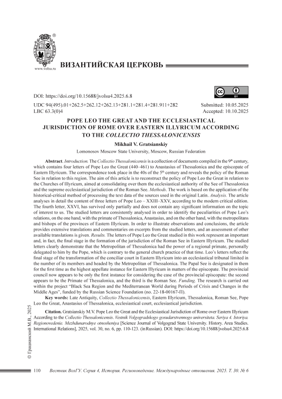 Введение. «Фессалоникское собрание» – составленная в IX в. подборка документов, в которой содержатся четыре послания папы Льва Великого (440–461) к Анастасию Фессалоникскому и епископату Восточного Иллирика. Переписка имела место в 40-е гг. V в. и раскрывает политику римской кафедры в отношении этого региона. Целью данной статьи является реконструкция политики папы Льва Великого в отношении иллирийских Церквей, направленная на закрепление над ними церковной власти престола Фессалоники и высшей церковной юрисдикции римского престола. Методы. Работа основана на применении историко-критического метода обработки данных текста источников, используемых в оригинале на латинском языке. Анализ. В статье подробно анализируется содержание трех писем папы Льва – XXIII–XXV, согласно современному критическому изданию. Четвертое письмо, XXVI, сохранилось лишь частично и не содержит сколько-нибудь существенной информации по интересующей нас теме. Изучаемые письма последовательно анализируются с целью выявления особенностей отношений папы Льва, с одной стороны, с предстоятелем Фессалоники Анастасием, а с другой – с митрополитами и епископами провинций Восточного Иллирика. В статье для наглядности наблюдений и выводов даются пространные переводы и комментарии к отрывкам изучаемых писем, а также оценка других имеющихся переводов. Результаты. Изученные в данной работе письма папы Льва Великого представляют собой важный и фактически завершающий этап становления в Восточном Иллирике юрисдикции римской кафедры. Изученные письма наглядно демонстрируют, что фессалоникский митрополит имел власть регионального примаса, лично делегированную ему папой, что идет вразрез с общецерковной практикой того времени. Послания Льва отражают завершающий этап преобразования соборного суда в Восточном Иллирике в ограниченный по составу церковный трибунал во главе с фессалоникским митрополитом. Папский престол в них впервые обозначается как высшая апелляционная инстанция для Восточного Иллирика по делам епископата. Провинциальный Собор оказывается теперь лишь первой инстанцией по рассмотрению дела провинциального епископата: второй оказывается фессалоникский примас, третьей же – римский престол. Финансирование. Исследование выполнено в рамках научного проекта «Причерноморье и Средиземноморский мир в эпоху кризисов и перемен Средневековья», поддержанного Российским научным фондом (№ 22-18-00167-П).