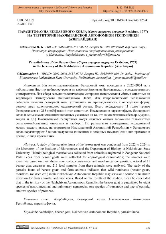 Изучение паразитофауны безоаровой козы проводили в 2022–2024 гг. в лаборатории Института биоресурсов и на кафедре Биология Нахчыванского государственного университета. Для сбора гельминтологического материала использованы убитые животные на территории Зангезурского Национального Парка. Для копрологических исследований собирали фекалии безоарвой козы, устанавили их принадлежность к определяли форму, размер, цвет, консистенцию, механический состав. Всего исследовано 11 голов трупов безоарого козла и 213 проб фекалий этих животных. Исследование паразитофауны безоарового козла и сельскохозяйственных животных указывает на то, что дикие жвачные (безоар, муфлон, косуля и др.) Нахчыванской Республики могут являться очагом заражения гельминтами сельскохозяйственных животных и наоборот. По результатам проведенных исследований можно сделать вывод, на территории Нахчыванской Автономной Республики у безоарового козла паразитируют 8 видов желудочно-кишечных и легочных нематод, один вид трематод и цестод, 2 вида простейших.