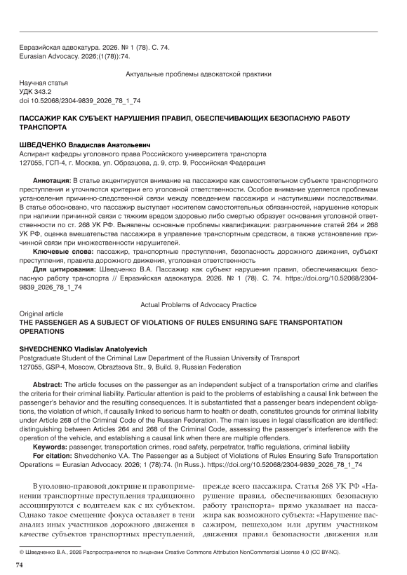 The article focuses on the passenger as an independent subject of a transportation crime and clarifies the criteria for their criminal liability. Particular attention is paid to the problems of establishing a causal link between the passenger’s behavior and the resulting consequences. It is substantiated that a passenger bears independent obligations, the violation of which, if causally linked to serious harm to health or death, constitutes grounds for criminal liability under Article 268 of the Criminal Code of the Russian Federation. The main issues in legal classification are identified: distinguishing between Articles 264 and 268 of the Criminal Code, assessing the passenger’s interference with the operation of the vehicle, and establishing a causal link when there are multiple offenders.