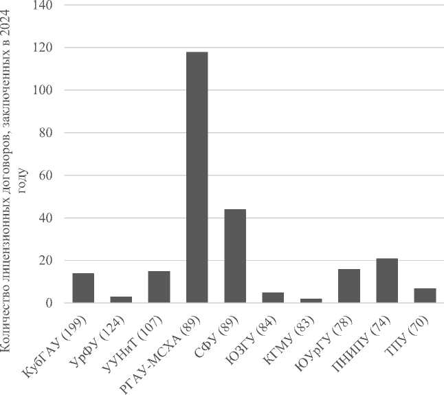 Рис. 4. Лицензионная активность университетов — лидеров по количеству патентов в 2024 году