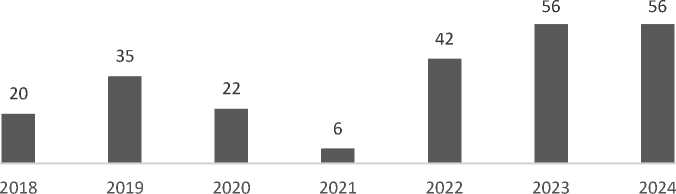 Fig. 6. Dynamics of patent activity at the Ural Federal University (1997–2024)