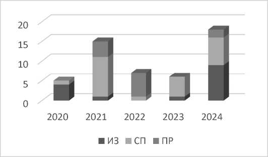 Общая статистика по договорам распоряжения правами на РИД за период с 2020 по 2024 гг. приведена на рис. 9.