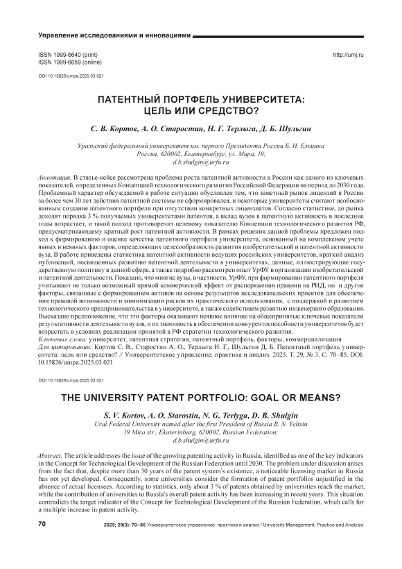 В статье-кейсе рассмотрена проблема роста патентной активности в России как одного из ключевых показателей, определенных Концепцией технологического развития Российской Федерации на период до 2030 года. Проблемный характер обсуждаемой в работе ситуации обусловлен тем, что заметный рынок лицензий в России за более чем 30 лет действия патентной системы не сформировался, и некоторые университеты считают необоснованным создание патентного портфеля при отсутствии конкретных лицензиатов. Согласно статистике, до рынка доходят порядка 3 % получаемых университетами патентов, а вклад вузов в патентную активность в последние годы возрастает, и такой подход противоречит целевому показателю Концепции технологического развития РФ, предусматривающему кратный рост патентной активности. В рамках решения данной проблемы предложен подход к формированию и оценке качества патентного портфеля университета, основанный на комплексном учете явных и неявных факторов, определяющих целесообразность развития изобретательской и патентной активности вуза. В работе приведены статистика патентной активности ведущих российских университетов, краткий анализ публикаций, посвященных развитию патентной деятельности в университетах, данные, иллюстрирующие государственную политику в данной сфере, а также подробно рассмотрен опыт УрФУ в организации изобретательской и патентной деятельности. Показано, что многие вузы, в частности, УрФУ, при формировании патентного портфеля учитывают не только возможный прямой коммерческий эффект от распоряжения правами на РИД, но и другие факторы, связанные с формированием активов на основе результатов исследовательских проектов для обеспечения правовой возможности и минимизации рисков их практического использования, с поддержкой и развитием технологического предпринимательства в университете, а также содействием развитию инженерного образования. Высказано предположение, что эти факторы оказывают неявное влияние на общепринятые ключевые показатели результативности деятельности вузов, и их значимость в обеспечении конкурентоспособности университетов будет возрастать в условиях реализации принятой в РФ стратегии технологического развития.