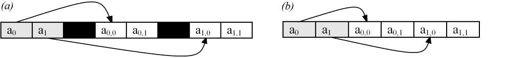 Fig. 1 . The layout of the elements of the 2D array 2 x 2 in memory for the method in Listing 2 ( a ) and Listing 3 ( b ). The gray fill shows the location of pointers to array rows.
