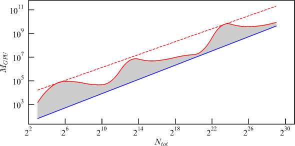 This leads to an unexpected problem in the case of the OpenACC technology in NVIDIA implementation. The size of the memory M GPU occupied by the array on the GPU may be significantly larger than the size of the memory of this array on the host M host (Fig- 2)- This difference can reach M GPU /M host — 100 according to the results of our computational experiments. The blue line shows the initial data size M host as a function of the number of array cells N tot . We compute the allocated memory size on the GPU M GPU [bytes] in 192 numerical experiments with different N tot on several computers at different points in time. All our simulation results lie inside the gray area, where the red line bounds the size of M GP U in our sample of numerical experiments. The red dashed line shows the possible upper limit of the memory size allocated on the device. Memory allocation may not be repeated for different program runs, since the result depends on the processes executed by the operating system before starting the application program.