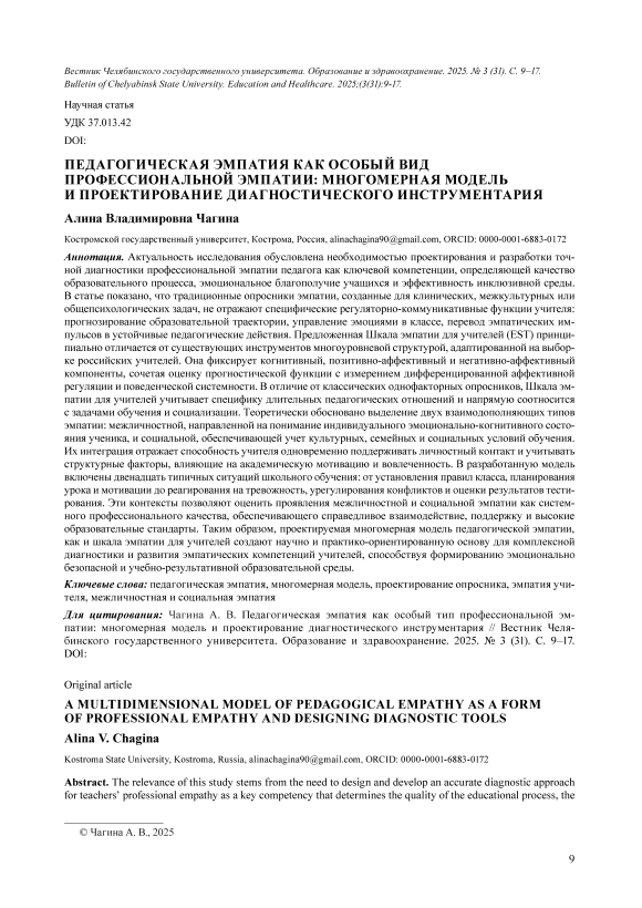 Актуальность исследования обусловлена необходимостью проектирования и разработки точной диагностики профессиональной эмпатии педагога как ключевой компетенции, определяющей качество образовательного процесса, эмоциональное благополучие учащихся и эффективность инклюзивной среды. В статье показано, что традиционные опросники эмпатии, созданные для клинических, межкультурных или общепсихологических задач, не отражают специфические регуляторно-коммуникативные функции учителя: прогнозирование образовательной траектории, управление эмоциями в классе, перевод эмпатических импульсов в устойчивые педагогические действия. Предложенная Шкала эмпатии для учителей (EST) принципиально отличается от существующих инструментов многоуровневой структурой, адаптированной на выборке российских учителей. Она фиксирует когнитивный, позитивно-аффективный и негативно-аффективный компоненты, сочетая оценку прогностической функции с измерением дифференцированной аффективной регуляции и поведенческой системности. В отличие от классических однофакторных опросников, Шкала эмпатии для учителей учитывает специфику длительных педагогических отношений и напрямую соотносится с задачами обучения и социализации. Теоретически обосновано выделение двух взаимодополняющих типов эмпатии: межличностной, направленной на понимание индивидуального эмоционально-когнитивного состояния ученика, и социальной, обеспечивающей учет культурных, семейных и социальных условий обучения. Их интеграция отражает способность учителя одновременно поддерживать личностный контакт и учитывать структурные факторы, влияющие на академическую мотивацию и вовлеченность. В разработанную модель включены двенадцать типичных ситуаций школьного обучения: от установления правил класса, планирования урока и мотивации до реагирования на тревожность, урегулирования конфликтов и оценки результатов тестирования. Эти контексты позволяют оценить проявления межличностной и социальной эмпатии как системного профессионального качества, обеспечивающего справедливое взаимодействие, поддержку и высокие образовательные стандарты. Таким образом, проектируемая многомерная модель педагогической эмпатии, как и шкала эмпатии для учителей создают научно и практико-ориентированную основу для комплексной диагностики и развития эмпатических компетенций учителей, способствуя формированию эмоционально безопасной и учебно-результативной образовательной среды.