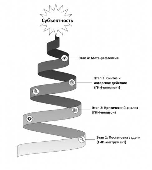 Теоретико-методологические основания и ключевые принципы модели. Концептуальной основой для проектирования модели послужили выводы наших предыдущих исследований. Анализ трансформации оппозиции «Я –Другой» в современных условиях [4] позволил интерпретировать взаимодействие «студент – ГИИ» как особую форму диалога-встречи, где алгоритм последовательно выступает в роли «Другого» – от опосредованного «Оно» до провокационного «Ты». Опираясь на данный теоретический конструкт, в рамках предлагаемой модели мы определяем «диалог с ГИИ» как асинхронный диалог позиций, реализуемый через специально организованную последовательность учебных ситуаций, в которых студент последовательно меняет стратегии взаимодействия (ГИИ-инструмент → ГИИ-полигон → ГИИ-оппонент), фокусируясь не на содержании генерируемых текстов, а на выявлении в них механизмов производства смысла: стереотипов, риторических уловок, манипуляций, пустоты за внешней связностью. Этот анализ побуждает студента постоянно восстанавливать границы собственной авторской позиции, противостоящей алгоритмической имитации мышления. Данный процесс составляет ядро становления профессиональной субъектности в предлагаемой модели. Это позволило переосмыслить угрозу десубъективации не как непреодолимую данность, а как поле для игрового сценария становления авторской позиции. Кроме того, разработанная ранее методика навигации в гипертекстовой среде [12] с ее акцентом на переход от «серфинга» к «медленному» и «активному» чтению, легла в основу процессуальной логики спирали взаимодействия.