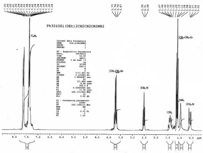 Спектр 1Н-ЯМР 3-аминопропил(трифенилсилокси)(диэтокси)силана (Ph 3 SiO)(EtO) 2 Si-CH 2 CH 2 CH 2 -NH 2 (I)