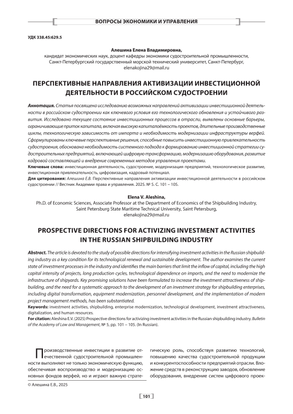 Статья посвящена исследованию возможных направлений активизации инвестиционной деятельности в российском судостроении как ключевого условия его технологического обновления и устойчивого развития. Исследовано текущее состояние инвестиционных процессов в отрасли, выявлены основные барьеры, ограничивающие приток капитала, включая высокую капиталоёмкость проектов, длительные производственные циклы, технологическую зависимость от импорта и необходимость модернизации инфраструктуры верфей. Сформулированы ключевые перспективные решения, способные повысить инвестиционную привлекательность судостроения, обоснована необходимость системного подхода к формированию инвестиционной стратегии судостроительных предприятий, включающей цифровую трансформацию, модернизацию оборудования, развитие кадровой составляющей и внедрение современных методов управления проектами.