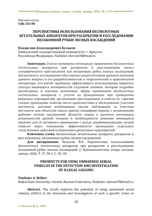 Статья посвящена потенциалу применения беспилотных летательных аппаратов при раскрытии и расследовании такого специфического преступления как незаконная рубка лесных насаждений. Актуальность исследования обусловлена недостаточным уровнем изучения данного вопроса и его разработанностью в теоретической и практической литературе, что влечёт проблемы эффективного использования широкого спектра имеющихся возможностей подобной техники. Автором подробно рассмотрены и изучены возможные сферы применения беспилотных летательных аппаратов с учетом их функционала при проведении рейдовых мероприятий, организации преследования и поиска по горячим следам, проведение осмотра места происшествия и обследование участков местности, доставка необходимых грузов, наблюдение за участком местности или объектом сквозь призму специфики борьбы с незаконными рубками лесных насаждений. Делается вывод о высоком потенциале возможностей данной техники и необходимости решения имеющихся проблем для её активного применения с целью декриминализации лесной отрасли через повышение эффективности проведения отдельных следственных действий и оперативно-розыскных мероприятий.