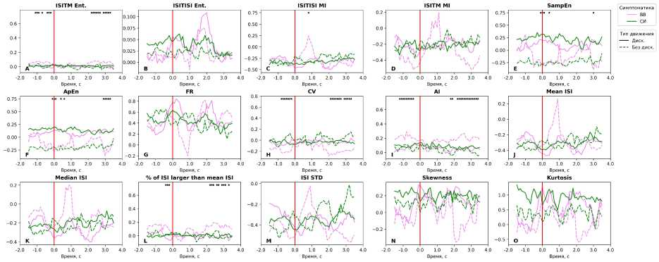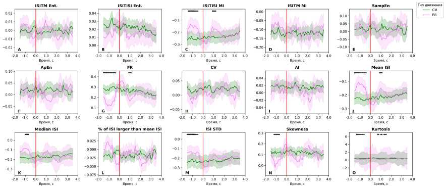 В результате предобработки экспериментальных данных было выделено 103 микро-электродных записи, соответствующих критериям анализа. Для нейронов субталамических ядер пациентов с БП были обнаружены статистически значимые отличия между типами движений (FDR adj. р-value < 0.05) для таких параметров, как ISITM MI, частота импуль-саций, среднее, медианное значение и стандартное отклонение межимпульсных интервалов, а также коэффициентов асимметрии и эксцесса (рис. 1). При этом отличия выявляются в период от -1,5 до -0,5 с до начала совершения движений и от 0,7 до 1,2 с в процессе совершения движений, тогда как в момент начала совершения движений (0 с) отличия не обнаруживаются для всех исследованных параметров. Кроме того, статистически значимые отличия по сравнению с фоновой активностью определяются только при совершении ВВ движений, тогда как СИ движения не сопровождаются значимыми отклонениями изученных параметров.