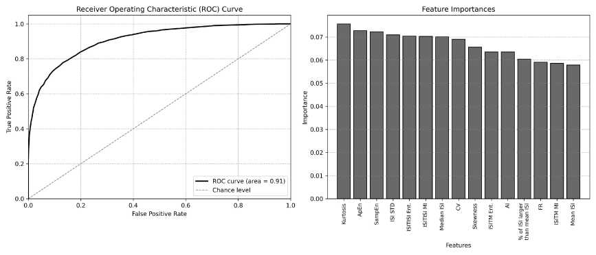 Рис. 3. Результаты обучения классификатора случайного леса в задаче определения внешневызван-ных и самоинициированных движений по параметрам одиночной нейронной активности. Слева -кривая ошибок первого и второго рода (ROC AUG curve); справа - значимость параметров в задаче классификации