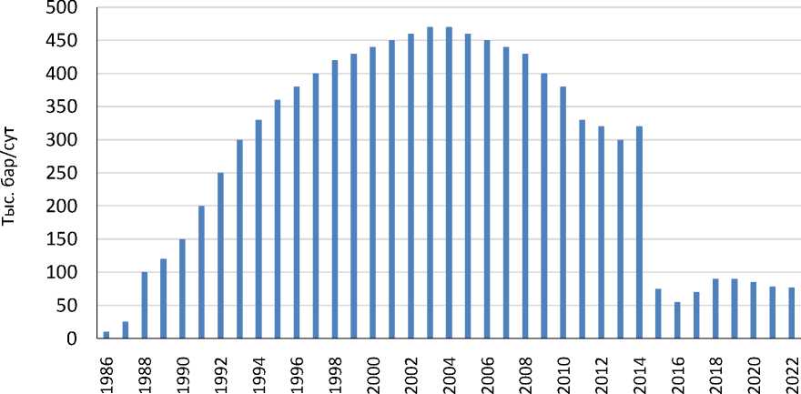 Рис. 2. Среднесуточная добыча нефти в Йемене с 1986 по 2022 гг.