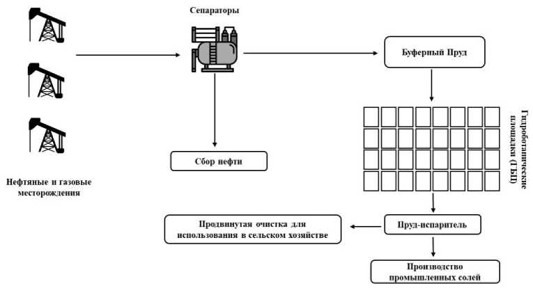 Очистка попутной воды включает многоэтапный процесс удаления загрязняющих веществ и обеспечения ее безопасности для орошения. Распространенные методы очистки включают предварительную обработку, которая удаляет крупные частицы и остатки нефти с помощью гравитационного разделения, скимминга или фильтрации, обратного осмоса; биологической очистки, при которой микроорганизмы разлагают органические загрязнители и снижают химическое потребление кислорода, как на гидроботанических площадях ГБП [15, 16]. Однако обратный осмос и другие методы невозможно применять в стране, как Йемен, поэтому ГБП является подходящим предложением. Эти процессы могут быть адаптированы для устранения специфического состава попутной воды, обеспечивая ее соответствие стандартам орошения, установленным такими организациями, как продовольственная и сельскохозяйственная организация ООН (FAO) (см. таблицу). Ключевые параметры качества воды для орошения включают соленость, коэффициент поглощения натрия, уровни токсичных элементов, таких как тяжелые металлы и углеводороды, а также отсутствие патогенов. Высокие затраты, потребности в энергии и техническом обслуживании технологий, таких как обратный осмос, создают значительные трудности в условиях ограниченных ресурсов. В таких контекстах природные решения, такие как ГБП, предлагают более устойчивую и экономически эффективную альтернативу. Системы ГБП используют естественные процессы, включающие растения, микроорганизмы и почву, для очистки попутной воды, удаляя загрязняющие вещества, такие как углеводороды, тяжелые металлы и взвешенные частицы [16-18]. Сначала происходит отделение и восстановление большей части нефти из попутной воды с использованием серии поверхностных сепараторов. Затем попутная вода распределяется на гидроботанические площадки (ГБП) через длинный буферный пруд. Очищенная вода самотеком поступает в серию испарительных прудов, где её можно либо переработать в промышленную соль как конечный продукт, либо направить на дополнительную очистку для использования в сельском хозяйстве (рис. 3). Этот подход был успешно внедрен в таких странах, как Оман, где технология камышовых зарослей используется для очистки попутной воды в нефтяной отрасли. Применяя аналогичные решения, Йемен мог бы решить проблемы нехватки воды, снизить экологические риски и обеспечить надежный источник воды для сельского хозяйства, одновременно минимизируя затраты и технические сложности.