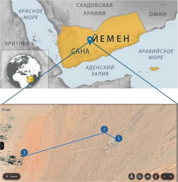 Рис. 4. Расположение нефтяного месторождения в пустыне юго-восточной части Аравийского полуострова в Йемене (вверху) и предлагаемая система ГБП (внизу)