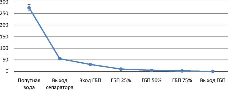 Рис. 5. Значение концентрации нефти в воде на различных этапах очистки ГБП [5]
