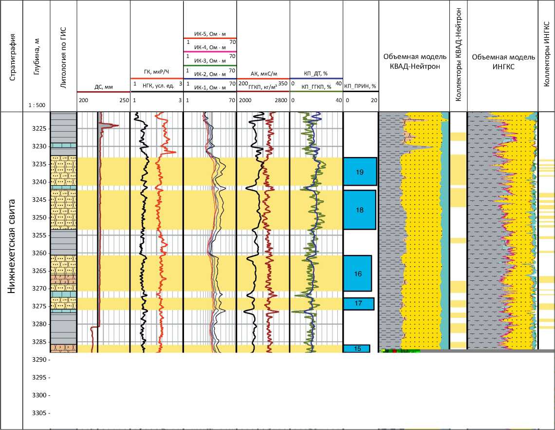 К сожалению, по техническим причинам не был использован метод ядерно-магнитного каротажа, который подтвердил бы это, поэтому были проведены исследования двумя независимыми нейтронными методами в закрытом стволе, которые подтвердили присутствие коллекторов и их насыщение УВ.