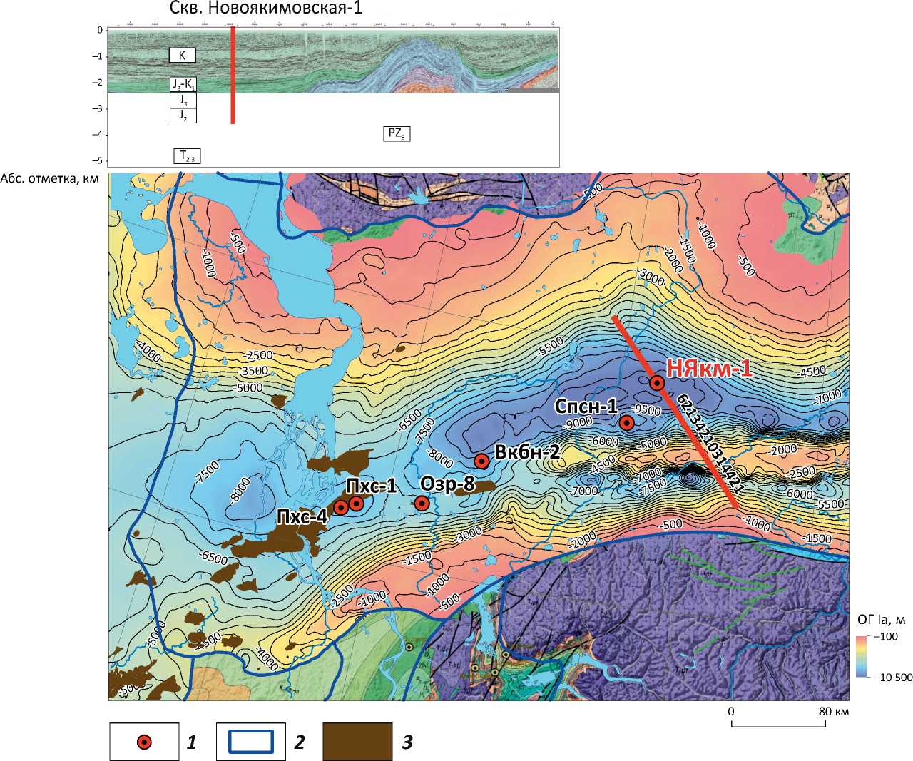 Рис. 2. Сейсмический разрез по профилю в районе заложения скв. Новоякимовская-1 [1] Fig. 2. Seismic section along the line in the area of Novoyakimovskaya-1 well drilling [1]