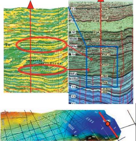 Место заложения скважины было выбрано на пересечении двух сейсмических профилей с учетом структурных построений и интерпретации методом Оптимизационной технологии динамической интерпретации [1, 2] (рис. 2).