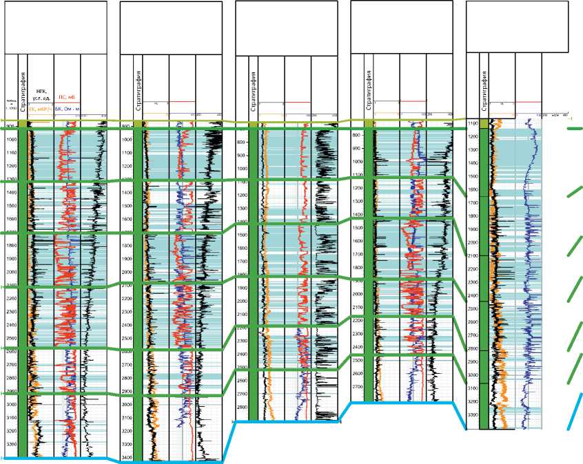 Однако по результатам изучения скважинных данных и сейсморазведки было установлено, что в интервале 3400–4000 м не наблюдается уверенного отражения, которое можно было бы ассоциировать с ОГ Б и соответственно с подошвой яновстанов-ской свиты. Ближайшая контрастная акустическая