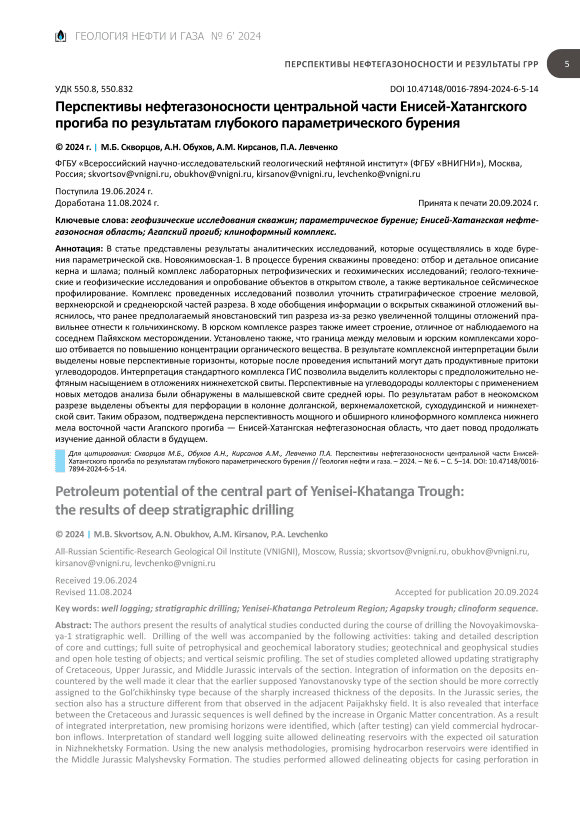 The authors present the results of analytical studies conducted during the course of drilling the Novoyakimovskaya-1 stratigraphic well. Drilling of the well was accompanied by the following activities: taking and detailed description of core and cuttings; full suite of petrophysical and geochemical laboratory studies; geotechnical and geophysical studies and open hole testing of objects; and vertical seismic profiling. The set of studies completed allowed updating stratigraphy of Cretaceous, Upper Jurassic, and Middle Jurassic intervals of the section. Integration of information on the deposits encountered by the well made it clear that the earlier supposed Yanovstanovsky type of the section should be more correctly assigned to the Gol’chikhinsky type because of the sharply increased thickness of the deposits. In the Jurassic series, the section also has a structure different from that observed in the adjacent Paijakhsky field. It is also revealed that interface between the Cretaceous and Jurassic sequences is well defined by the increase in Organic Matter concentration. As a result of integrated interpretation, new promising horizons were identified, which (after testing) can yield commercial hydrocarbon inflows. Interpretation of standard well logging suite allowed delineating reservoirs with the expected oil saturation in Nizhnekhetsky Formation. Using the new analysis methodologies, promising hydrocarbon reservoirs were identified in the Middle Jurassic Malyshevsky Formation. The studies performed allowed delineating objects for casing perforation in Neocomian Dolgansky, Verkhnemalokhetsky, Sukhodudinsky, and Nizhnekhetsky formations. Thereby, prospectivity of the Yenisei-Khatanga Petroleum Region — thick and wide-ranging Lower Cretaceous clinoform sequence in the eastern part of the Agapsky trough — has been confirmed, which gives a reason to continue studies in this area in the future.