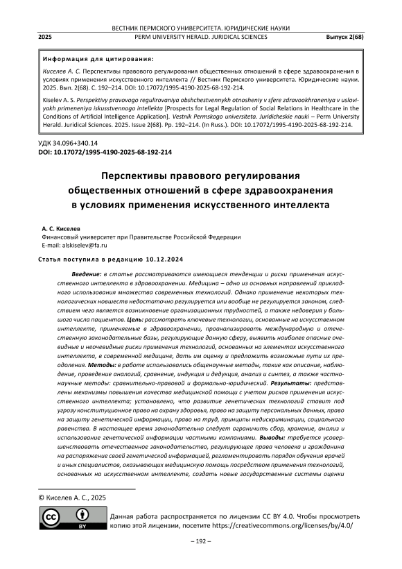 Введение: в статье рассматриваются имеющиеся тенденции и риски применения искусственного интеллекта в здравоохранении. Медицина – одно из основных направлений прикладного использования множества современных технологий. Однако, применение некоторых технологических новшеств недостаточно или вообще не регулируется законом, следствием этого является возникновение организационных трудностей, а также вызывает недоверие у большого числа пациентов. Цель: рассмотреть основные технологии, основанные на искусственном интеллекте, применяемые в здравоохранении, проанализировать международную и отечественную законодательные базы, регулирующие данную сферу, выявить наиболее опасные очевидные и неочевидные риски применения технологий, основанных на элементах искусственного интеллекта, в современной медицине, дать им оценку и предложить возможные пути их преодоления. Методы: в работе использовались общенаучные методы, такие как описание, наблюдение, проведение аналогий, сравнение, индукция и дедукция, анализ и синтез, а также частно-научные методы: сравнительно-правовой и формально-юридический. Результаты: представлены механизмы повышения качества медицинской помощи с учётом рисков применения искусственного интеллекта; развитие генетических технологий ставит под угрозу конституционное право на охрану здоровья, право на защиту персональных данных, право на защиту генетической информации, право на труд, принципы недискриминации, социального равенства. В настоящее время законодательно следует ограничить сбор, хранение, анализ и использование генетической информацией частными компаниями. Выводы: требуется усовершенствовать отечественное законодательство, регламентирующее права человека и гражданина на распоряжение своей генетической информацией, регламентировать порядок обучения врачей и иных специалистов, оказывающих медицинскую помощь посредством применения технологий, основанных на искусственном интеллекте, создать новые государственные системы оценки качества врачебной деятельности. Повсеместное внедрение искусственного интеллекта во все общественные процессы – одна из главных тенденций нашего времени, поэтому крупномасштабные реформы права, здравоохранения, образования и научной деятельности, в связи с этим представляются неизбежными.