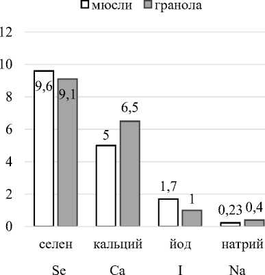Разработанные продукты обладают высокой АОА 0,17 мг/г и высокими показателями пищевой ценности, степень удовлетворения в основных нутриентах при употреблении 225 г гранолы и 178 г мюсли составляет от 12% до 30%. Продукты обогащены железом, магнием, медью (больше 50 мг/100г продукта), являются источником калия, кальция, молибдена. Кроме того, содержат селен, йод, натрий, что в значительной степени повышает их биологическую ценность, способствует укреплению иммунной системы, поддержанию функций щитовидной железы, регуляции водно-солевого баланса, стабилизации метаболических процессов. Продукты обеспечивают антиоксидантную защиту организма и профилактику широкого спектра заболеваний и могут быть рекомендованы, как резилиенс-компоненты рациона для организации функционального питания для здорового и активного долголетия.
