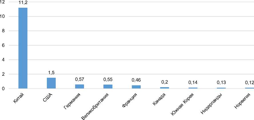 По продажам электромобилей в 2024 г. лидером выступает Китай с 11,2 млн шт. С учетом подключаемых гибридов доля продаж электромобилей превысила 48 %. В США покупка электромобилей составила 1,5 млн шт., третью позицию в рейтинге занимает Германия с 0,57 млн шт., и на четвертой его строчке находится Великобритания с 0,55 млн шт.3
