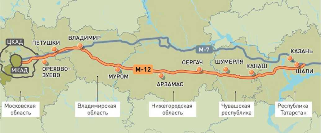 Скоростная автомобильная дорога М-12 «Восток» является частью международного транспортного маршрута «Европа-Западный Китай». Протяженность трассы составляет более 800 км [5].