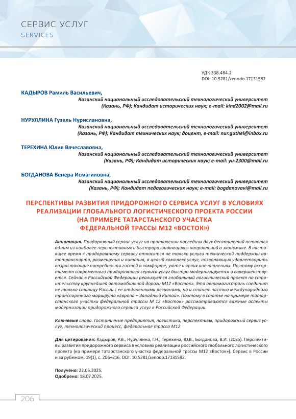 Перспективы развития придорожного сервиса в условиях реализации российского глобального логистического проекта (на примере татарстанского участка федеральной трассы М12 «Восток»)