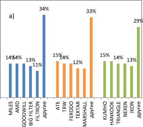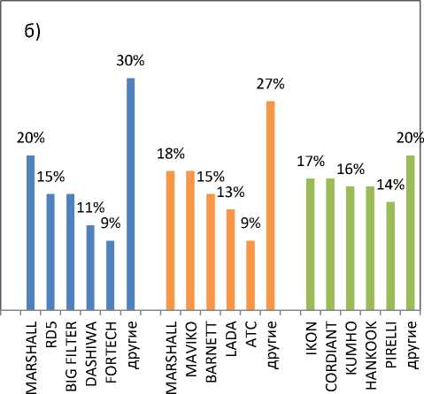 На рис. 2 показаны статистики заказов самых востребованных ЗЧ по брендам для автомобилей Lada Vesta в зависимости от региона (а – Южный федеральный округ; б – Уральский федеральный округ).