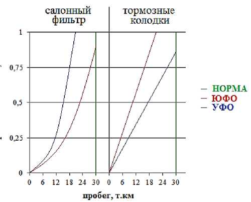 Салонный фильтр автомобилей, эксплуатирующихся в ЮФО был на 30 % чище, чем при аналогичном пробеге в ЮФО и нормативный ресурс был выдержан, а замена тормозных колодок потребовалась в среднем на пробеге 18 т.км при нормативе - 30 т.км (рис. 4). Состояние исследуемых элементов автомобиля показывает непосредственное влияние условий эксплуатации на их ресурс, который может выработаться до наступления нормативных значений.