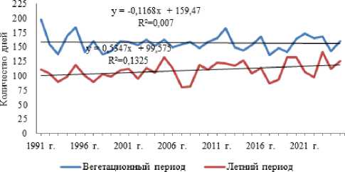 Рисунок 1. Динамика продолжительности вегетационного и летнего периодов в 1991-2025 годы.