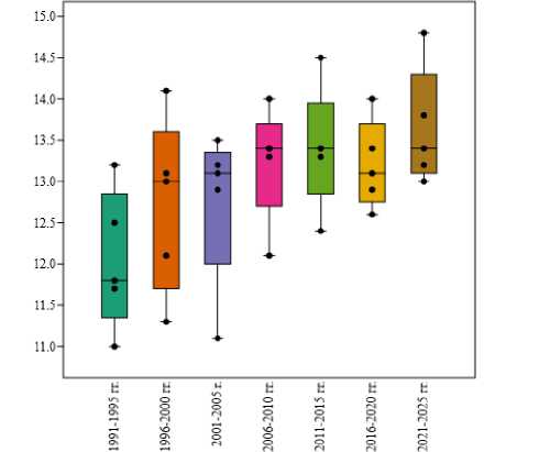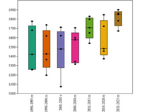 Анализ изменчивости температуры по пятилеткам показал наличие статистически значимых различий между ними (тест Краскела-Уоллиса, р=0,04) (рис. 4). Рост медианного значения суммы активных температур воздуха выше 10 °С начинается с третьей пятилетки (2001– 2005). Необходимо отметить снижение ΣtА>10 °С в период 2016–2020 гг. (Min=1374,0 °С, Max=1846,4 °С, М=1576,5 °С, Ме=1482,6 °С), но общий тренд на потепление сохраняется.