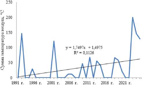 Figure 3. The accumulation dynamics of active air temperatures above 10 °C in 1991–2025.