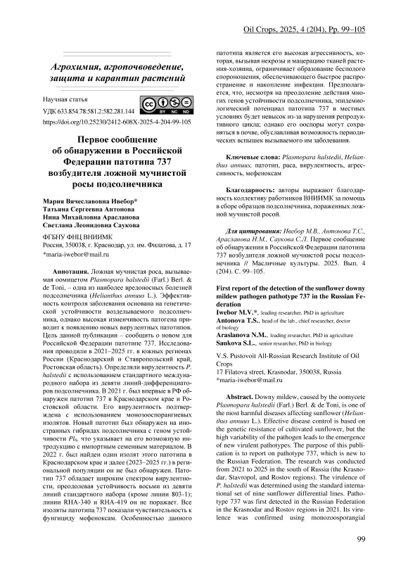 Первое сообщение об обнаружении в Российской Федерации патотипа 737 возбудителя ложной мучнистой росы подсолнечника