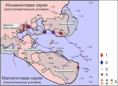 Рис. Карта распределения редокс-условий формирования пород Маглойского и близлежащих гранитоидных массивов Точки отбора проб: ильменитовой серии (1), магнетитовой серии (2); полезные ископаемые: шлихи (3), пункты минерализации (4), проявления (5)